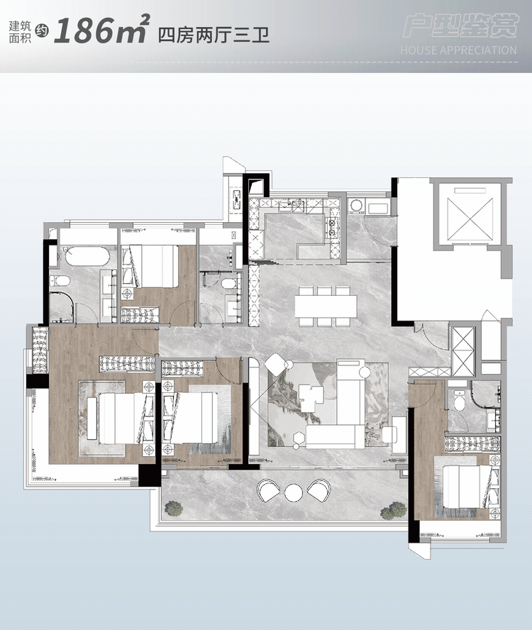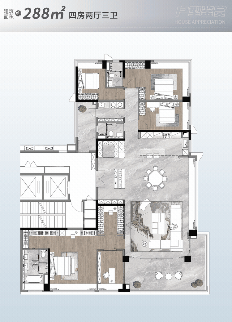 B 区 288㎡的 4 房 3 卫户型位于 36 座 2 梯 2 户,采光充脚。沉视通风和空间功能性的改善型购房者。